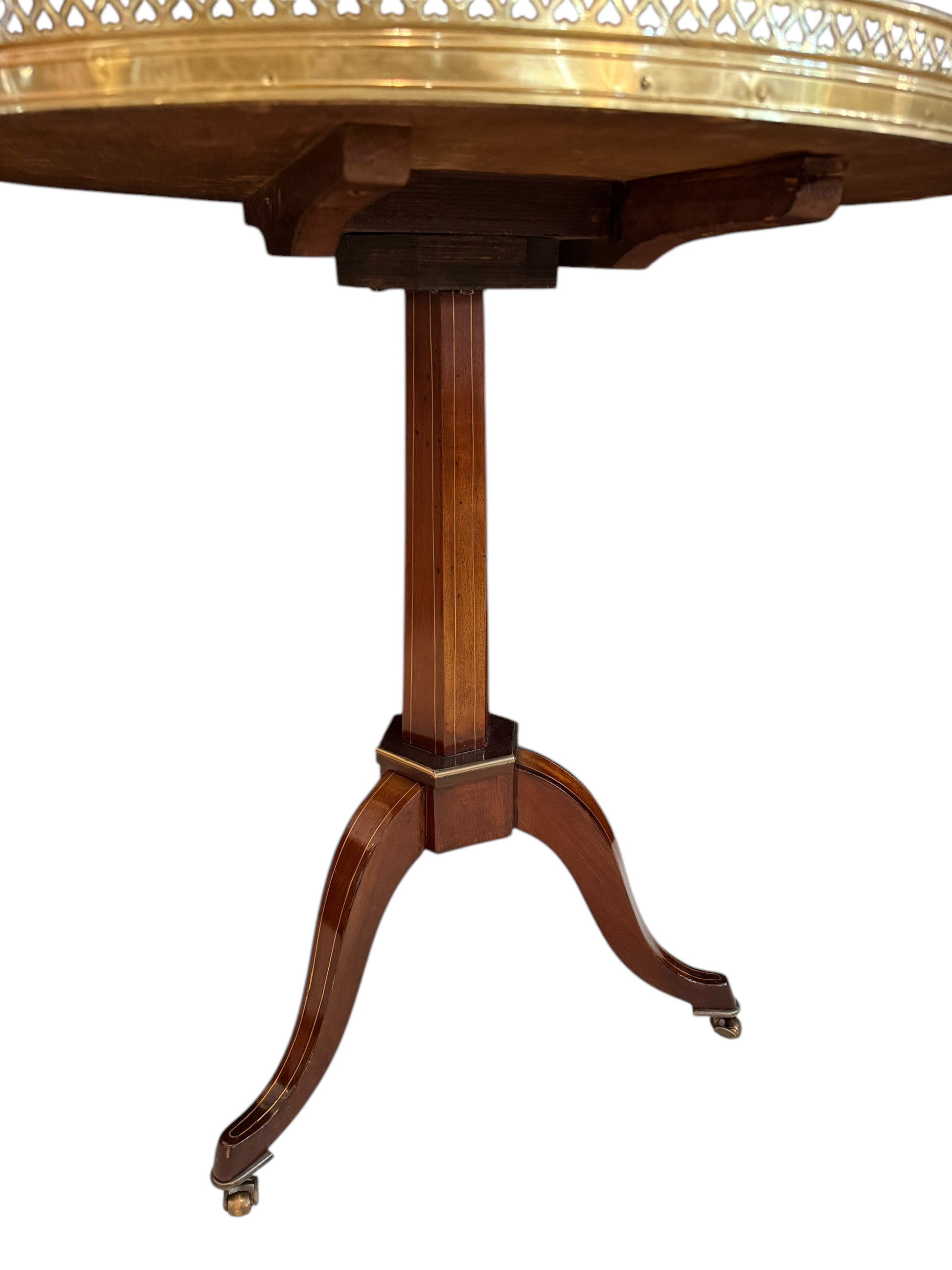 An elegant George III mahogany tripod table, dating to the late 18th century, circa 1770. The circular top is surrounded by a finely cast and pierced gilt-brass gallery, resting on a molded column and tripod base with splayed legs ending in brass castors.