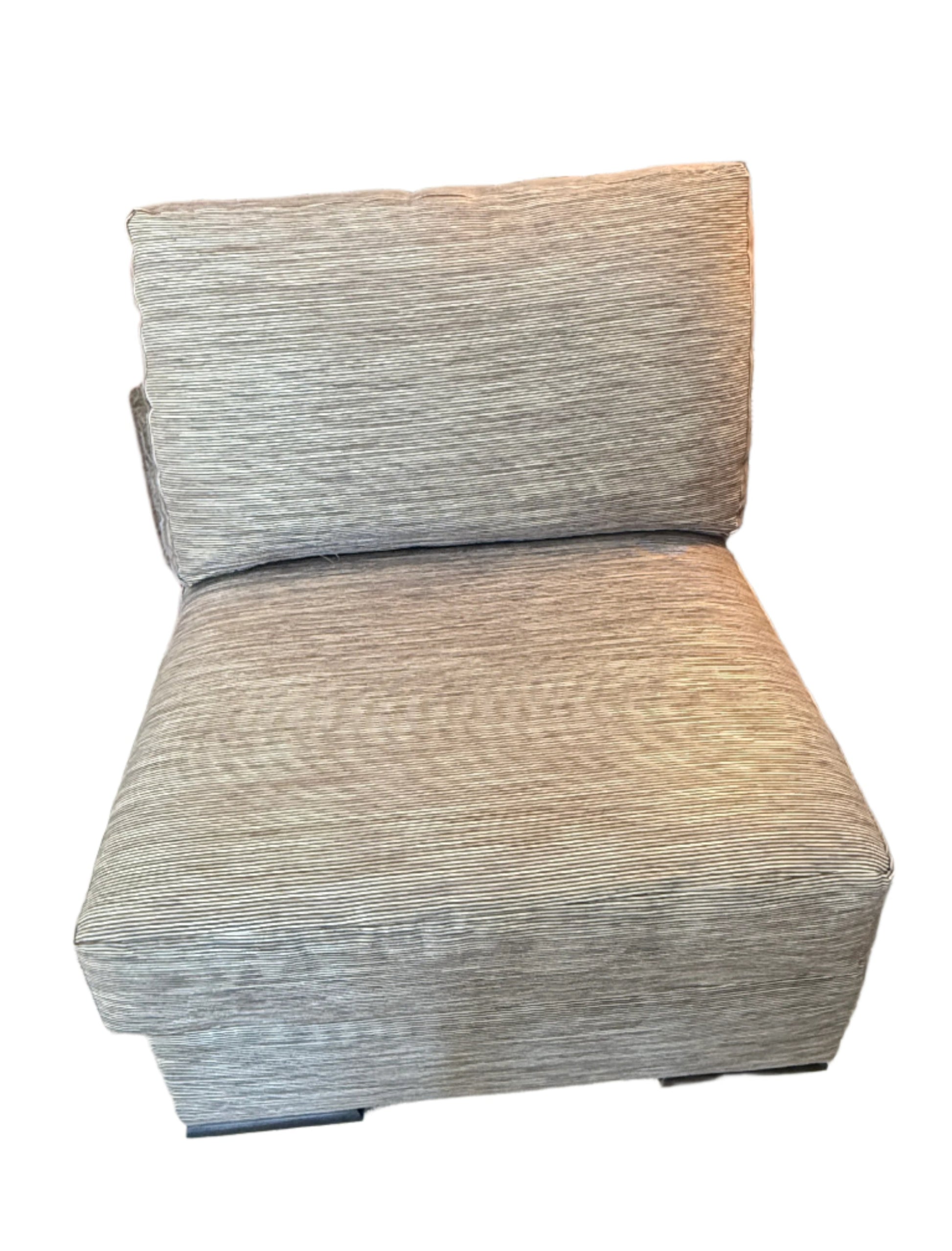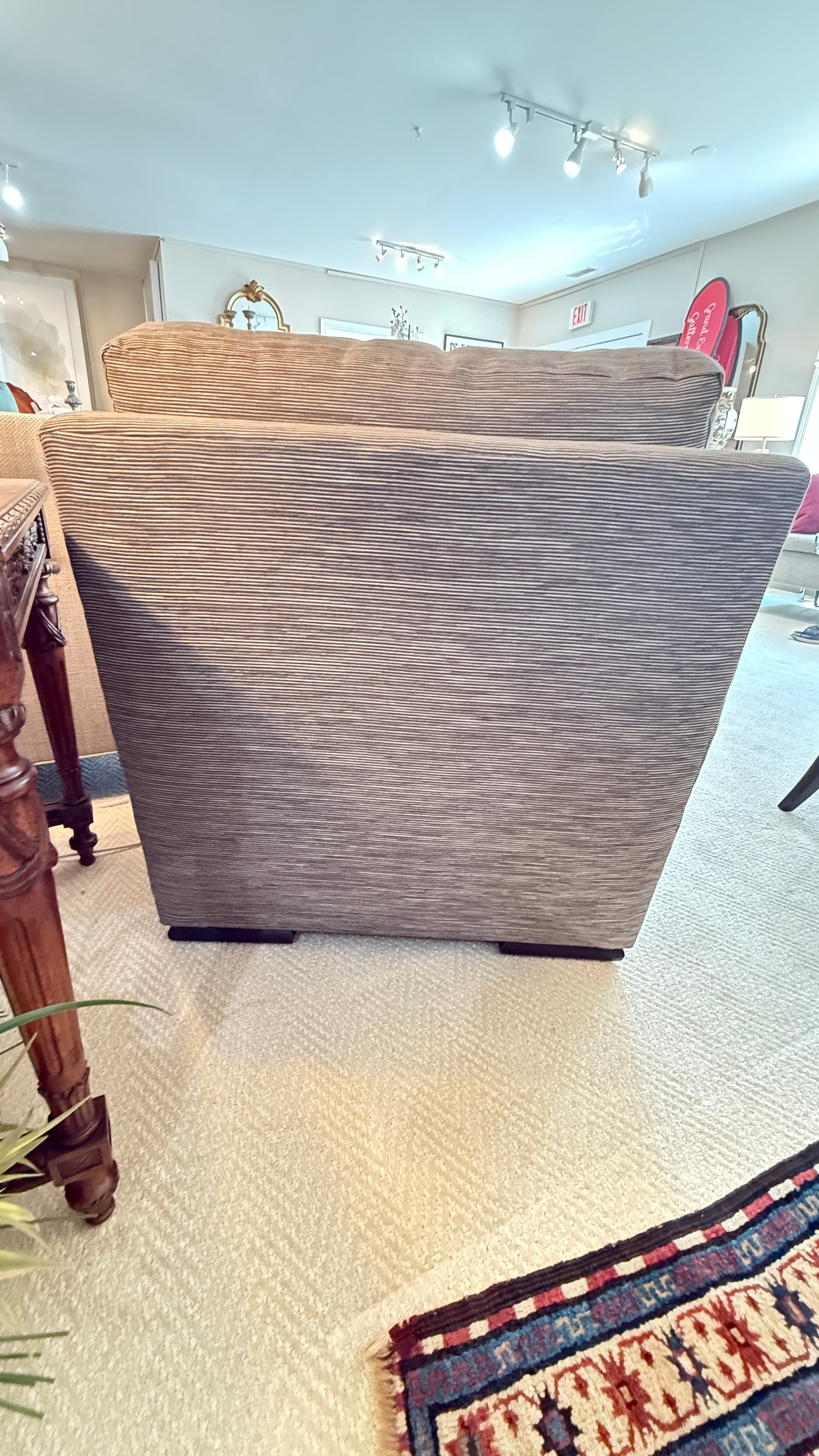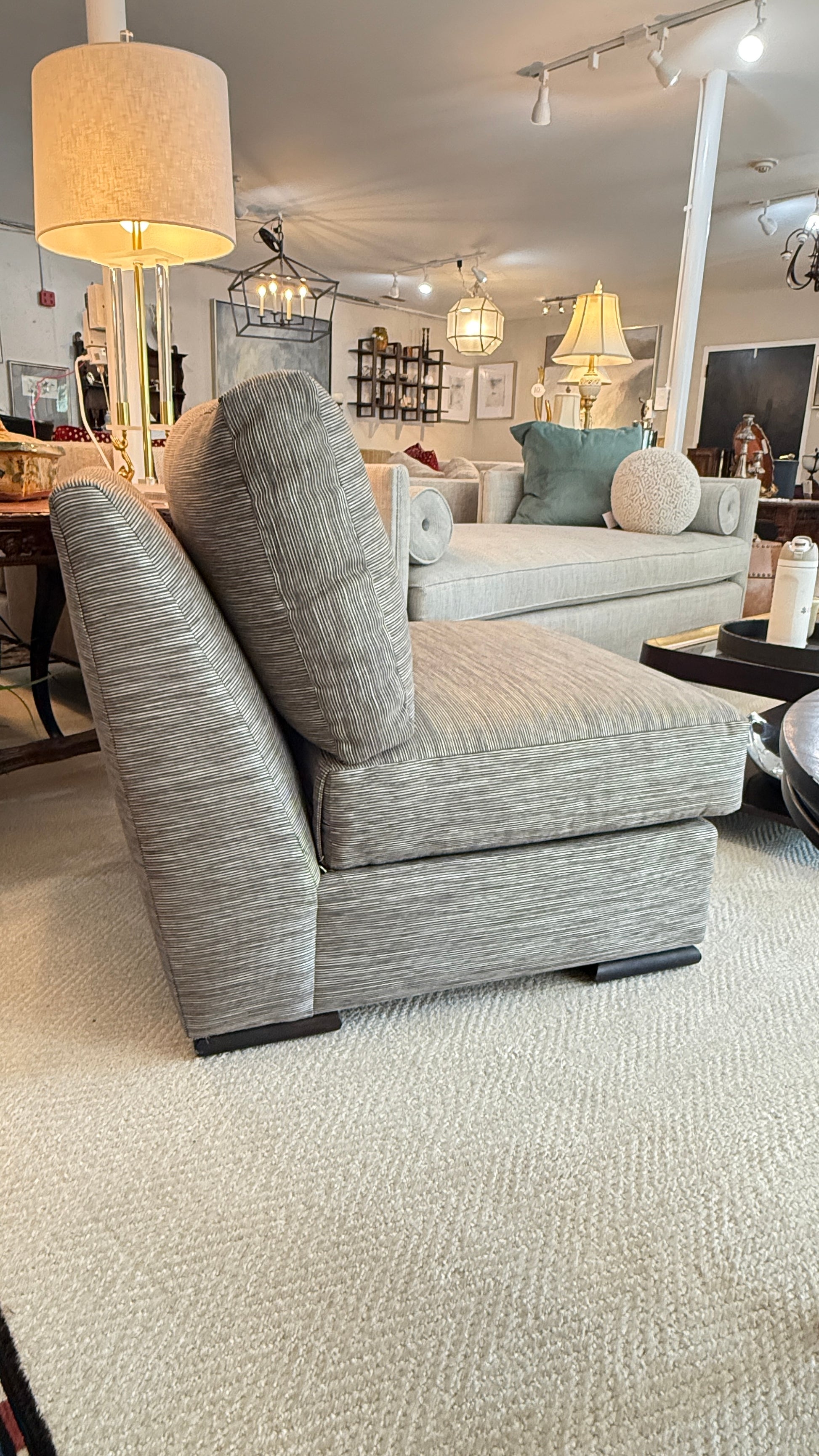 Super cool and cozy custom slipper chair by Kravet Furniture. Upholstery is a silky, light-shine black, grey/silver thin stripe. Barely use, still very firm, but comfy. Has the cushion locks to prevent slipping, nice back cushion for extra support and comfort. Perfect for any room.