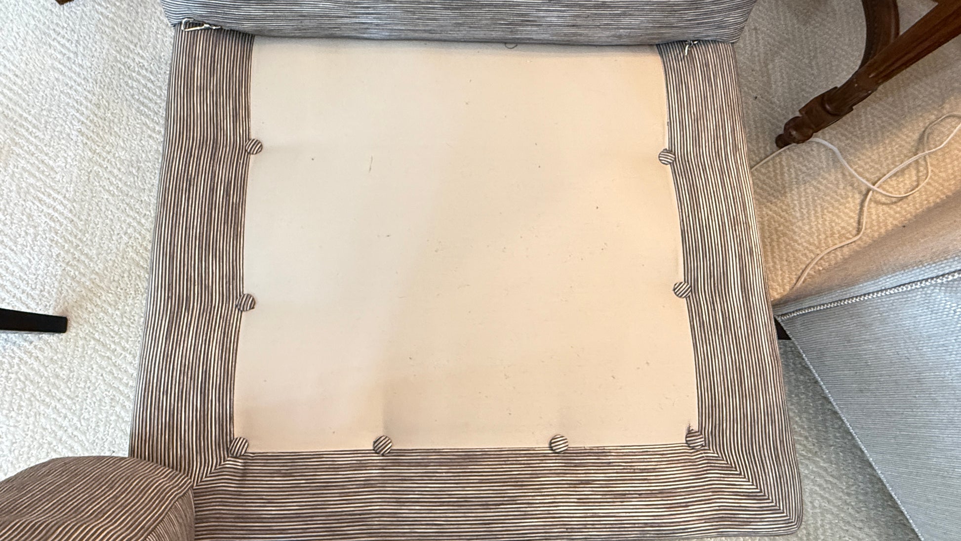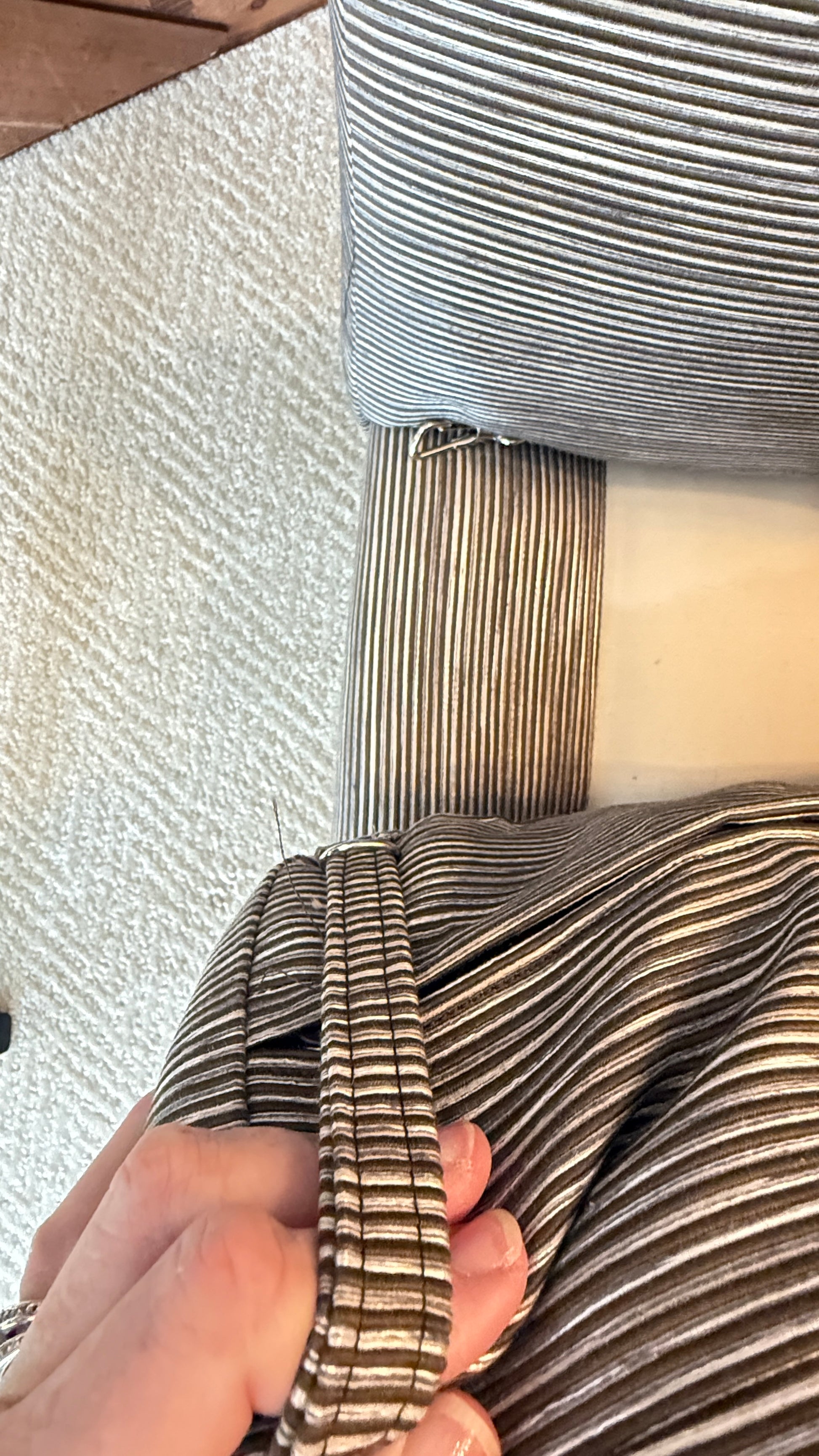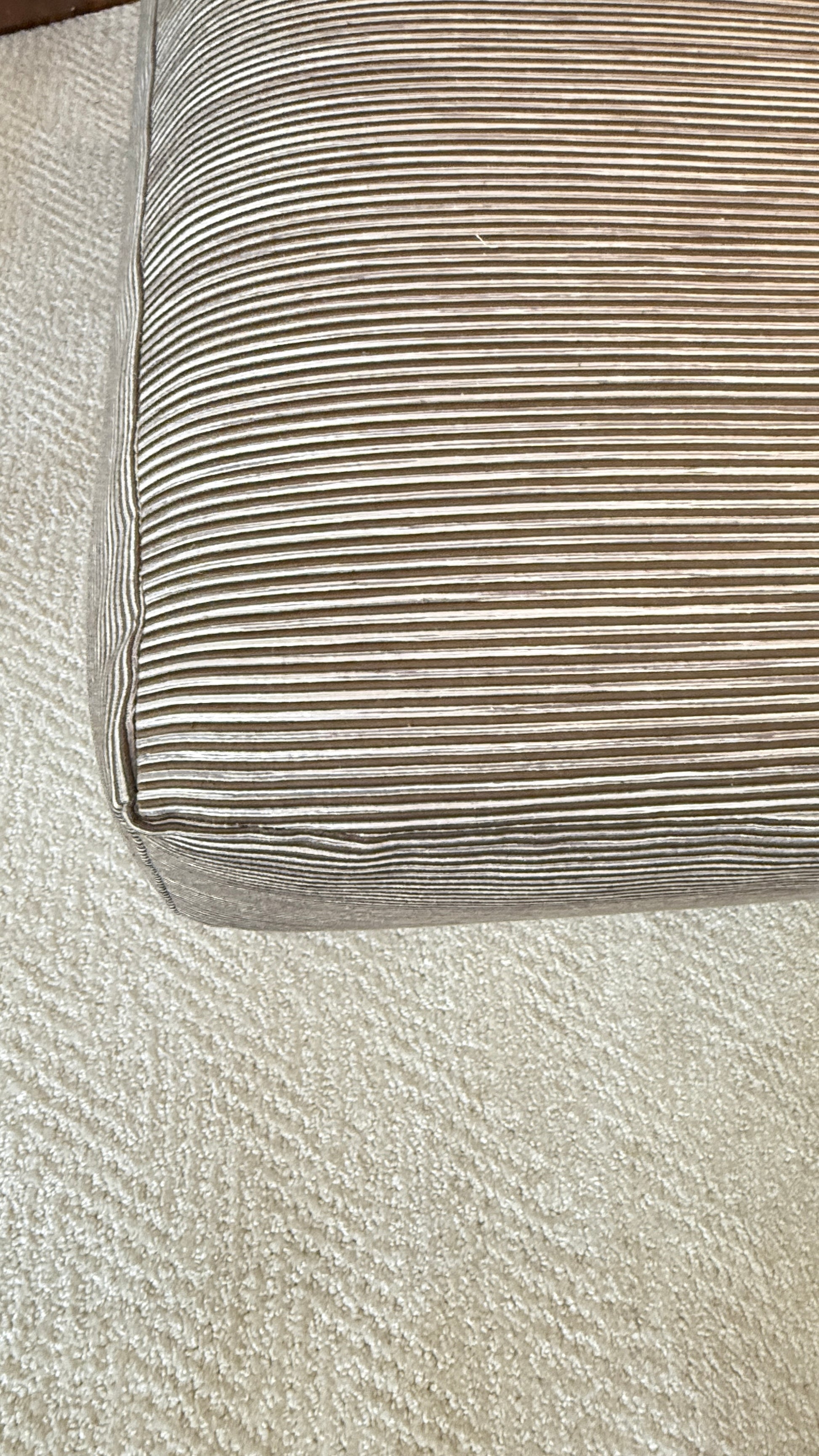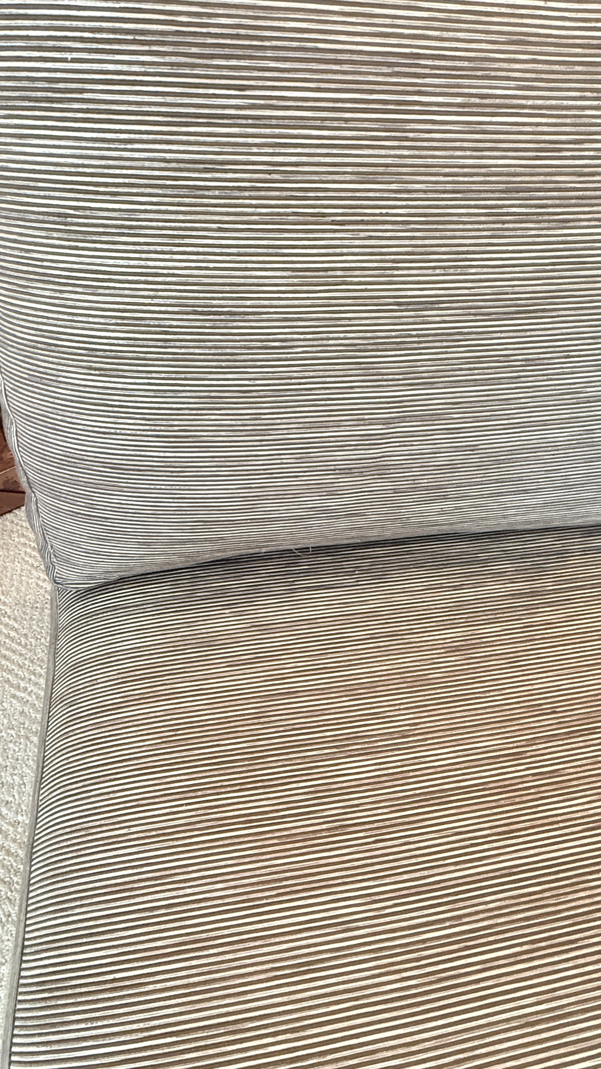 Super cool and cozy custom slipper chair by Kravet Furniture. Upholstery is a silky, light-shine black, grey/silver thin stripe. Barely use, still very firm, but comfy. Has the cushion locks to prevent slipping, nice back cushion for extra support and comfort. Perfect for any room.