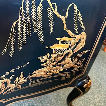 Introducing the exquisite Drexel Chinoiserie Style Small Chest & Mirror Set, a truly stunning addition to any entryway or living space. This elegant set features a traditional black and gold Asian hand-painted design, showcasing breathtaking scenery that will instantly elevate the atmosphere of your home.