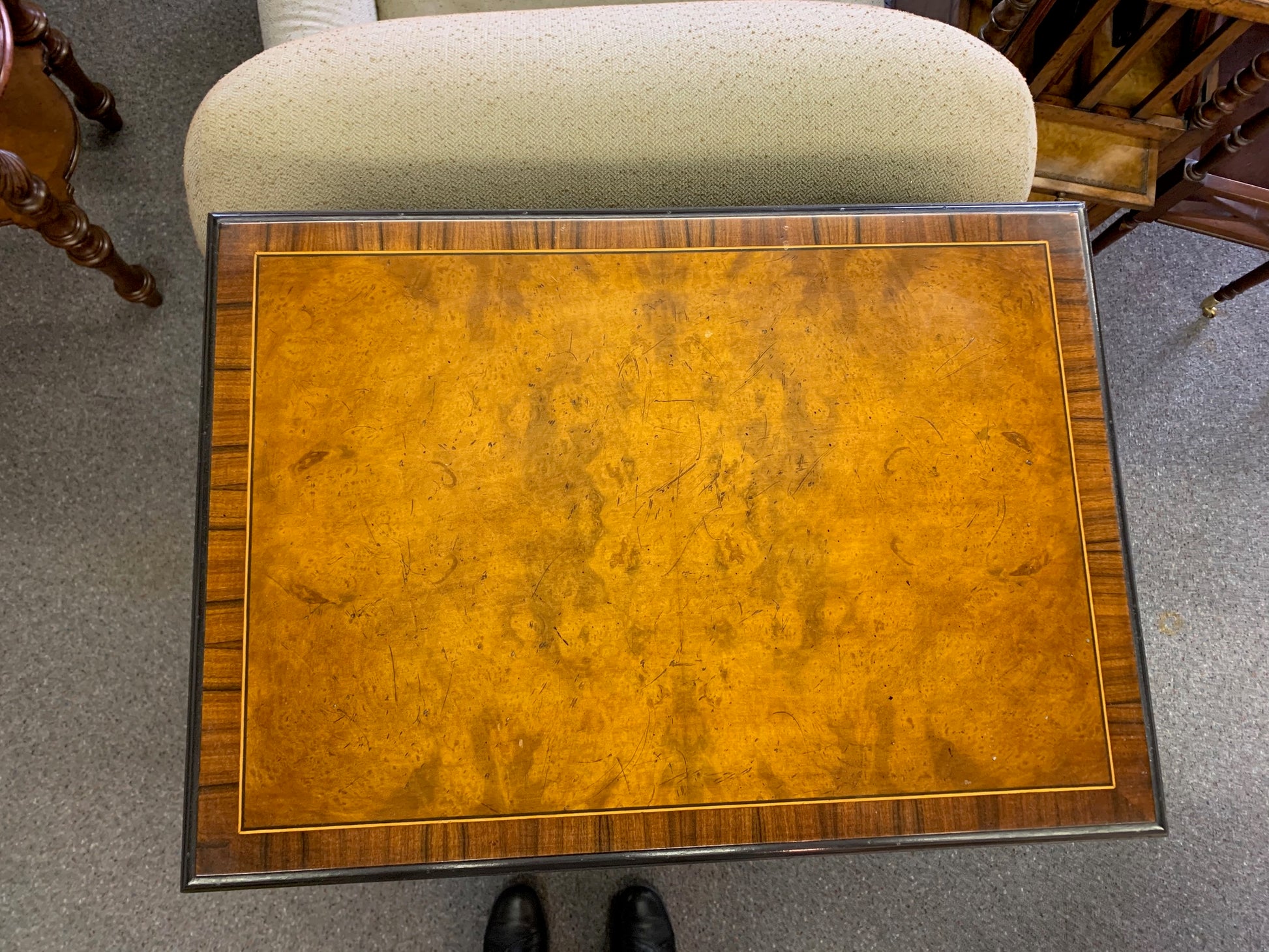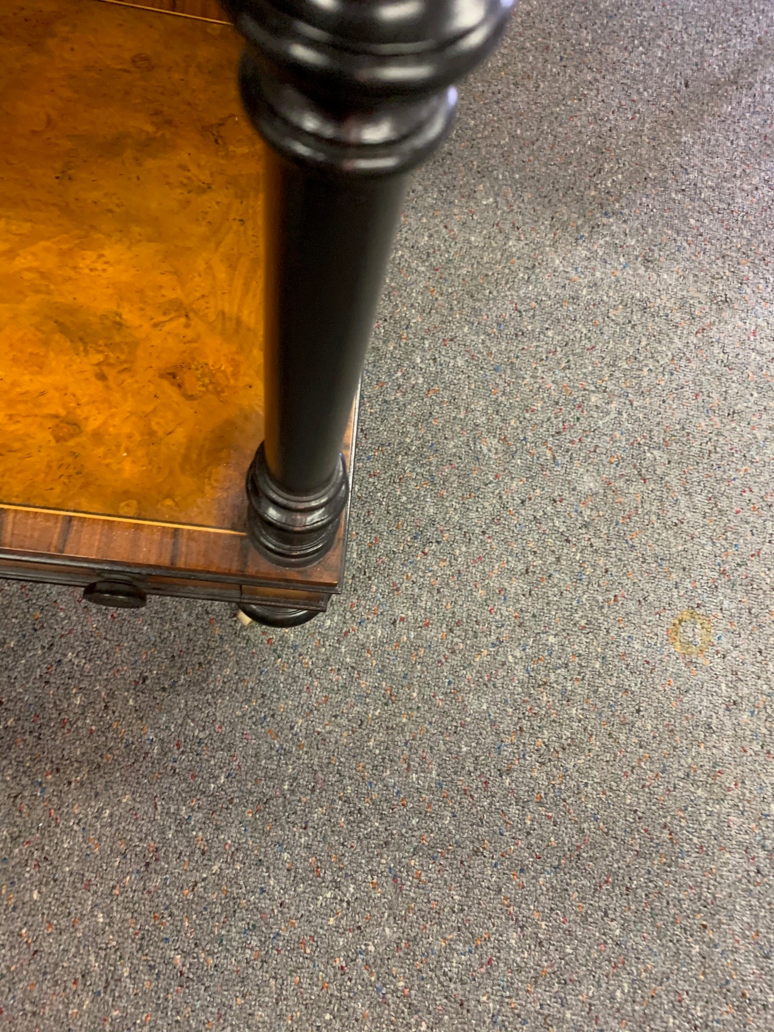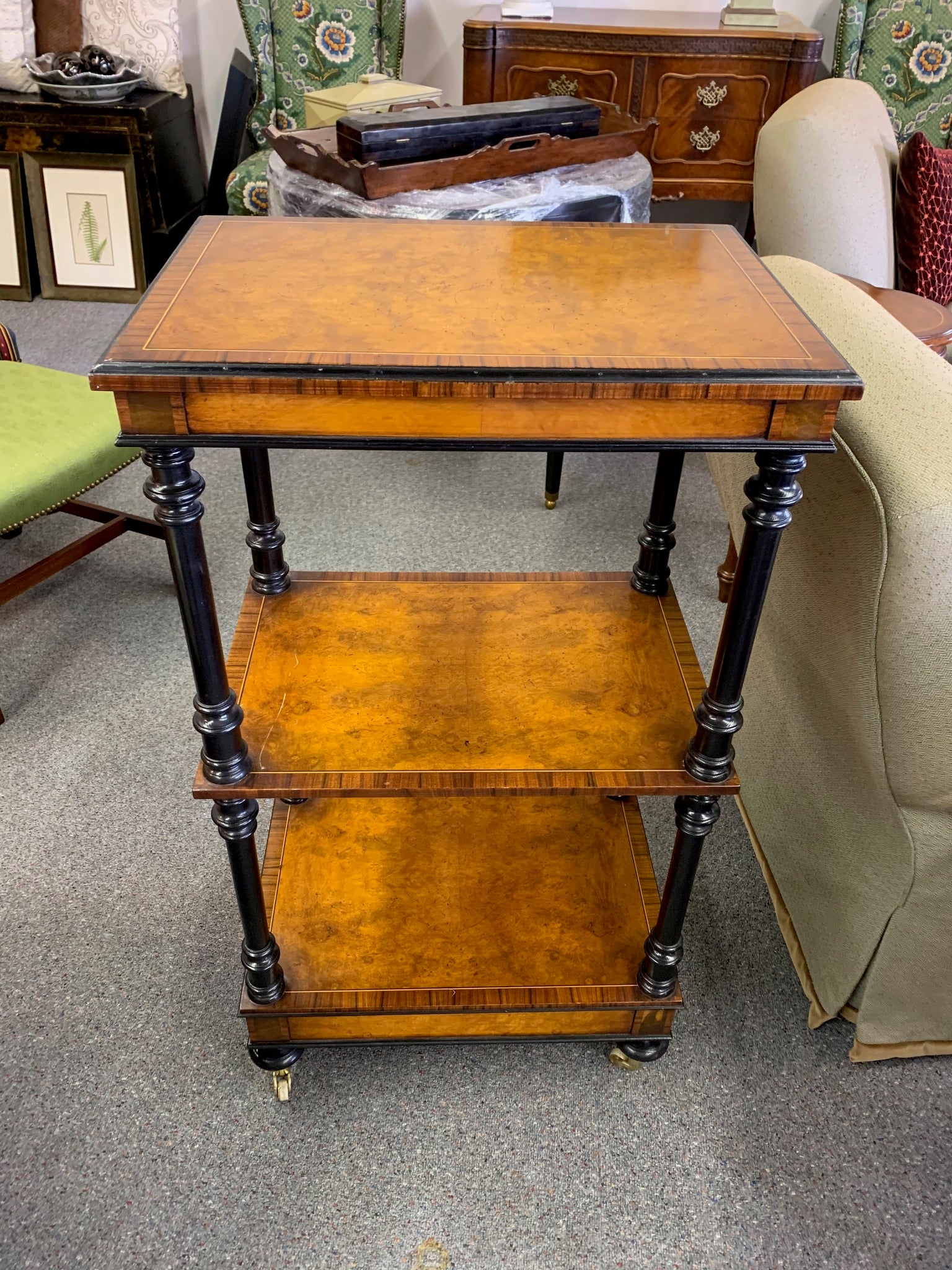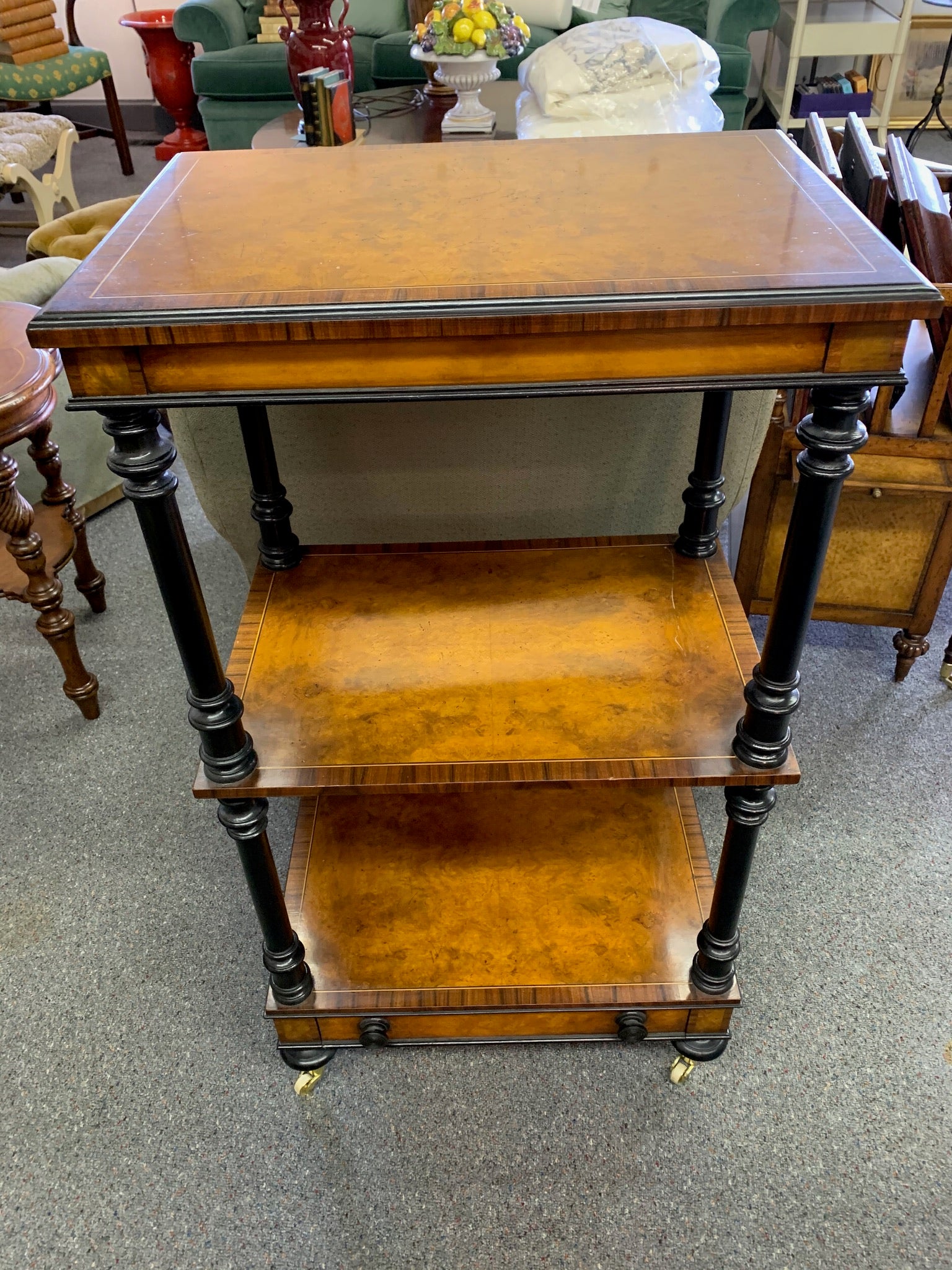 Awesome shelf unit on casters with storage drawer in the bottom. This burled wood triple shelf unit has black trim and beautiful inlay edge. Made in Italy. This could be a bookshelf, night stand, accent table, or display unit.
