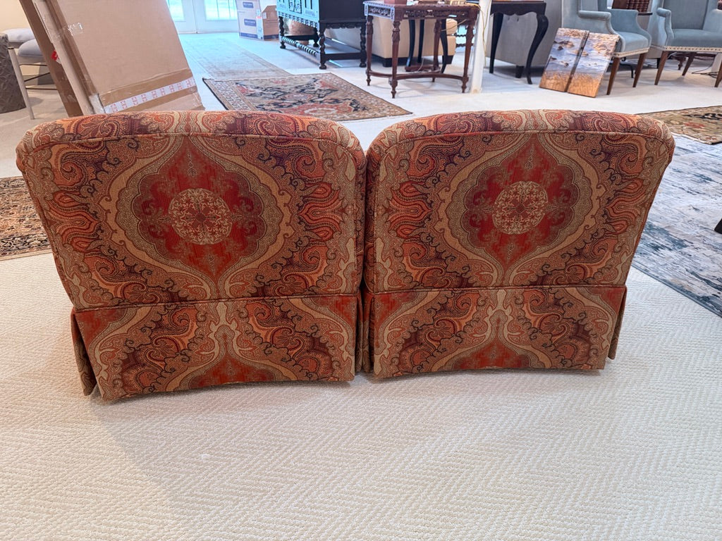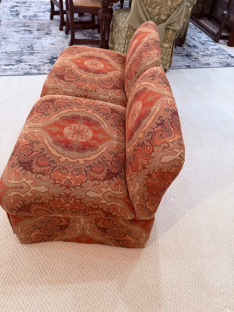 Elevate your living space with this exquisite pair of bohemian paisley slipper chairs by Pearson Furniture. Crafted with refined artisanal detail, these statement pieces blend global-inspired design with timeless elegance. The intricate paisley pattern and rich color palette add depth and character to any room, while the compact silhouette makes them ideal for intimate seating arrangements or accent placement. Perfect for collectors who appreciate curated, distinctive furnishings that spark conversation and reflect a cultivated aesthetic.