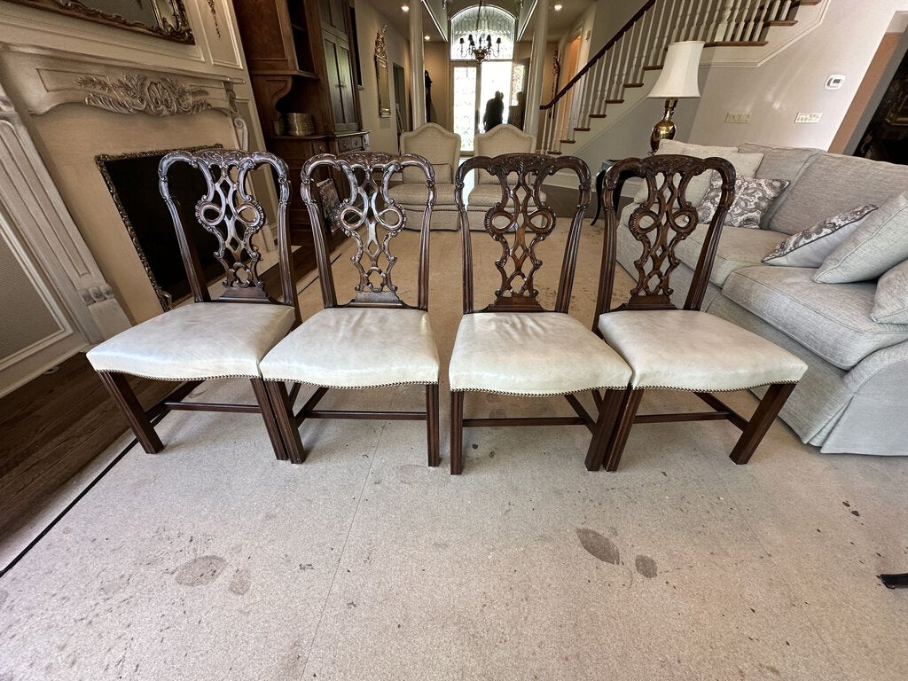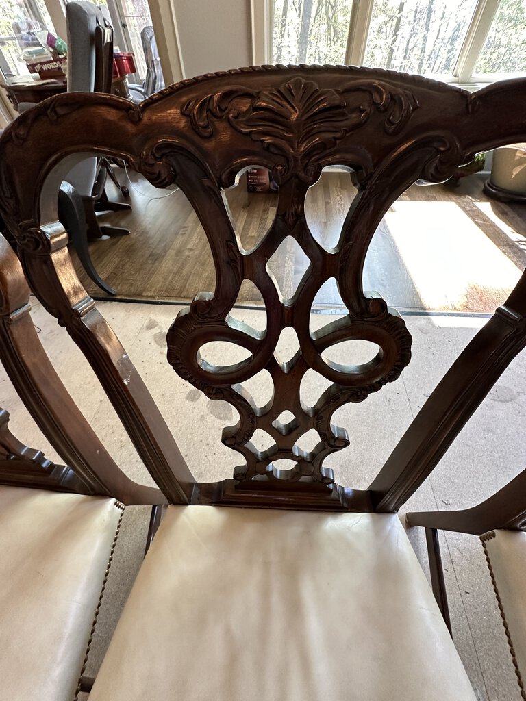 Gorgeous set of 4 chippendale style dining chairs with beige leather seats and nailhead trim. Very solid and leather in good condition. From smoke-free home.
